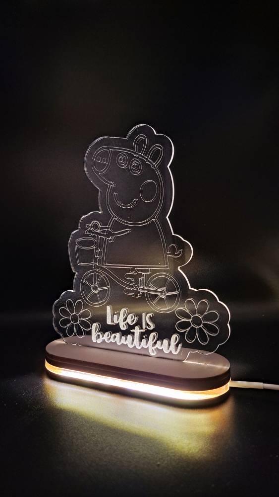 Φωτιστικό led με θέμα την Peppa . Με αυξομειώμενη ένταση φωτισμού και δυνατότητα αλλαγής της παράστασης. Συνδέεται σε οποιαδήποτε θύρα USB. Θα παραλάβετε σε συσκευασία δώρου.