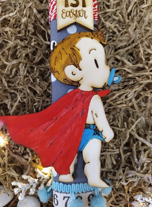 Αρωματική πασχαλινή λαμπάδα baby hero (30 εκ) με χειροποίητο ξύλινο διακοσμητικό