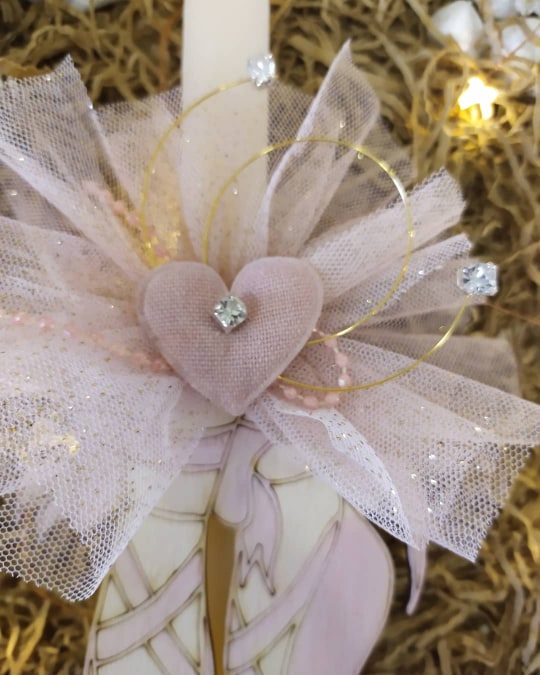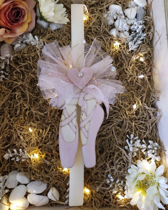 Αρωματική λαμπάδα ballet (30 εκ) με χειροποίητο ξύλινο διακοσμητικό βαμμένο στο χέρι. Στολισμένη με στρας και πομ πομ σε συσκευασία δώρου